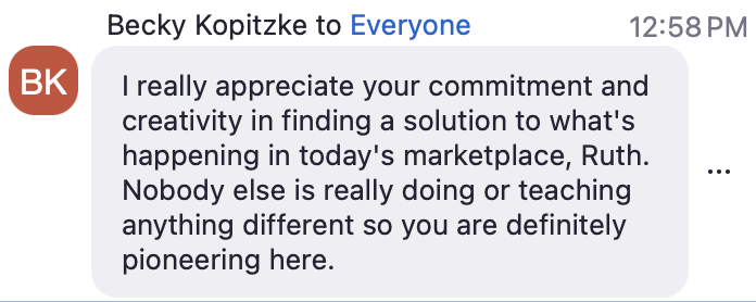 Thank you Ruth and team for creating this amazing experience!! You provide unique, passionate, helpful, much needed, valuable resources, wisdom, support and encouragement. I’m truly grateful!!! You’re all a blessing!! Please don’t ever take it away!!