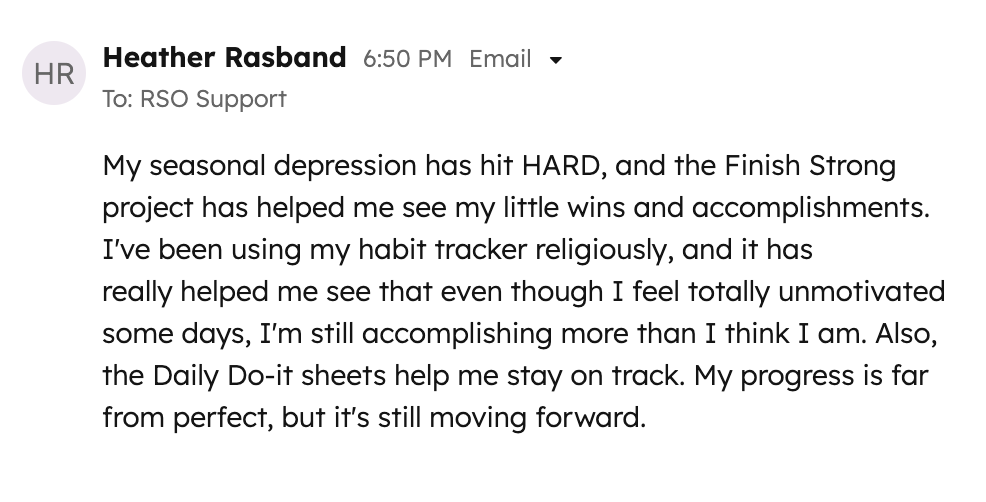 I just wanted to write to say I love your products. I bought LWSL years and years ago, and the love affair started! I’m on my fourth planner and have all your books. I’m almost done with Tame Your Time and just splurged on the cleaning bundle. I was one of the first to get your sneak peek for DIS and loved the assessment. Whew!! Thanks to your team there – so glad I found Ruth!!