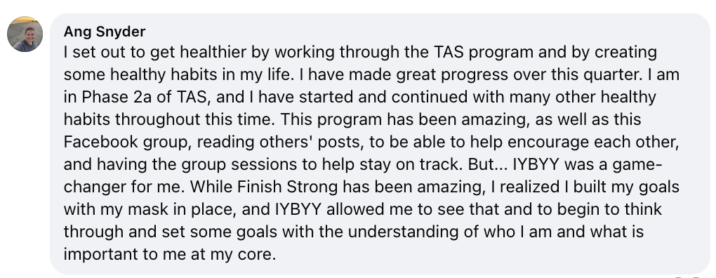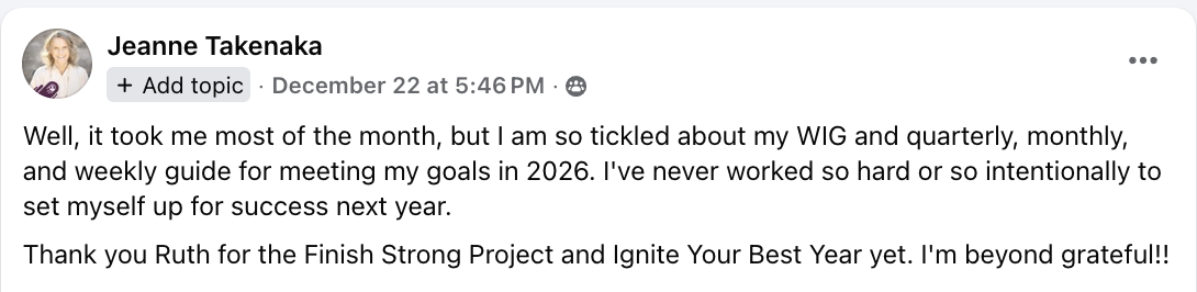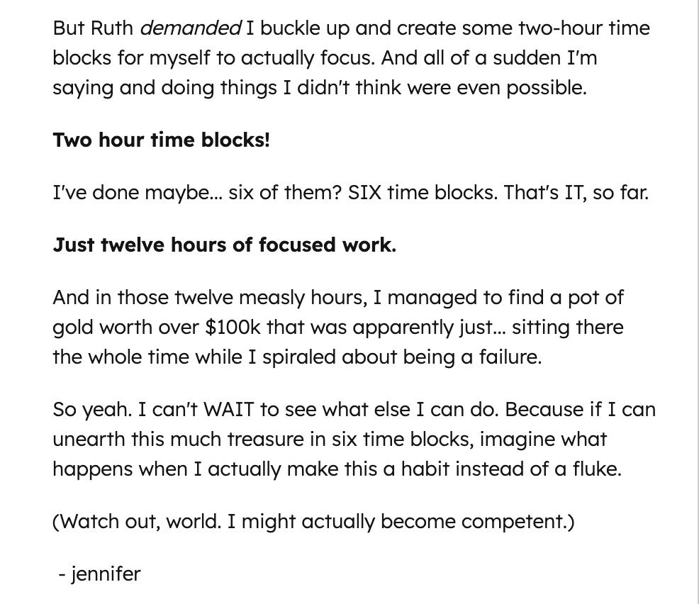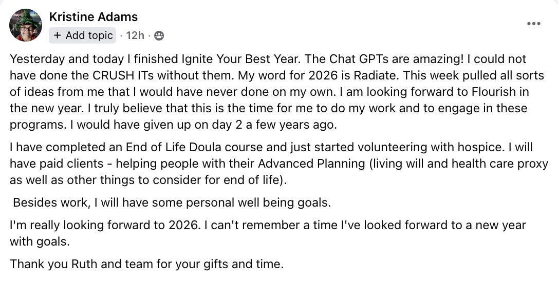 Ruth the teach was phenomenal, the homework impactful, the time to actually work on it during the class, the breakouts, and the Chat GPTs…, it was all so well thought out . And well executed. And you were right; we get more out if we put more in, so this week I invested a lot of time and energy. The result it: I feel great about the plan, and headed from years and years of trying to be someone else. I can’t explain how much more energy and PEACE I feel!